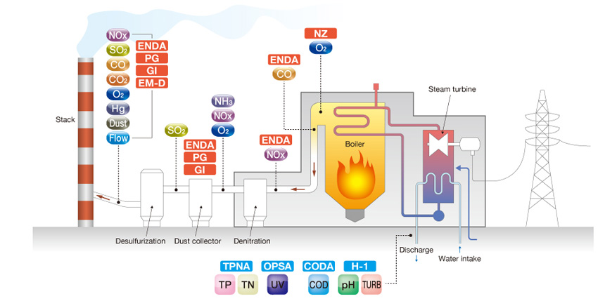 Sample measurement points of a general small/medium sized power facility with HORIBA analyzers
